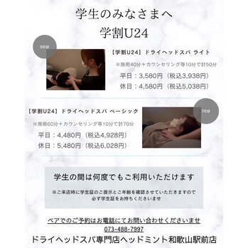・学割U24 ドライヘッドスパ(ライト)50分